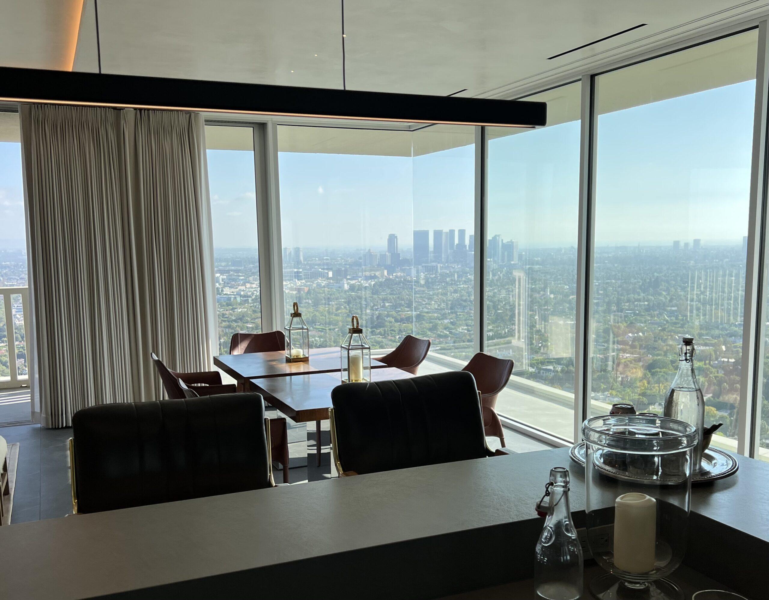 Photoshop Beta Prompt: interior view of a top floor modern apartment with dark tile floor and wood cabinets looking out at the city